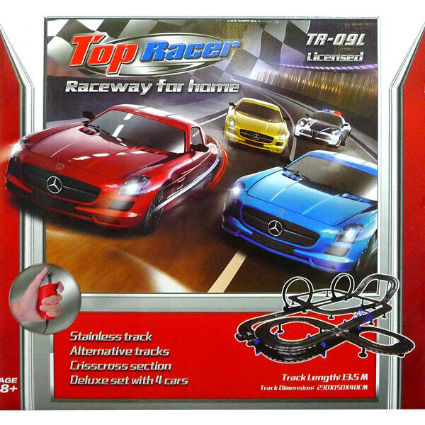 The Mercedes Police Chase is AGM Top Racers largest set. With a huge 13.5 metres of track, the racing fun will never stop, with more track combinations than you can possibly imagine. The kit also includes four Mercedes SLS cars , two controllers and a 240 volt transformer. This box contains everything you need to get racing!