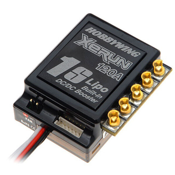 Continuous current: 120A; Max. short-term current: 200A; BEC voltage: 6V / 2A; Number of LiPo cells: 1-2; Number of NiCd/NiMH cells: 3-6; Resistance: 0.0003 Ohm; Weight: 105g; Dimensions: 43x36x33mm
