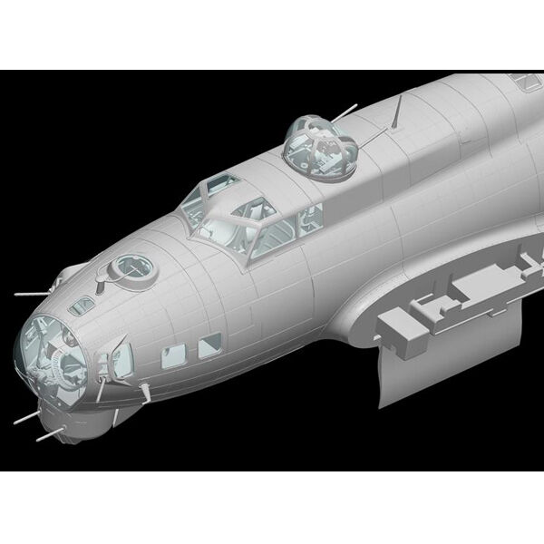 The Boeing B-27 'Flying Fortress' was one of the U.S.A.'s main four-engine heavy bombers, operating alongside the b-24 Liberator, and the later B-29 Superfortress, in all theatres of World War 2. It's a fact that the B-17 almost never saw its place in history and the defeat of Nazi Germany, as the prototype, know as Model 299, crashed due to pilot error during its evaluation in October 1935. Thankfully, the design had shown such promise during the testing phase, in fact, far exceeding the requirements of the original specification, that further prototypes were ordered despite Boeing losing the original contract with the United States Army Air Corps. It was this further evaluation that saw the type enter active service in 1938. The actual name 'Flying Fortress' was coined by a newspaper hack who witnessed a roll-out of the machine, bristling with guns and turrets, and Boeing realised that this was the sort of propaganda they needed, and trademarked the name. After the initial prototypes, serial production of the B-17 began with the B-17B variant, and underwent a major revision with the introduction of the 'E'. This type featured a substantially redesigned tail and fillet that featured throughout subsequent versions, giving the B-17 its iconic profile. An extra 10ft of length was added to the fuselage. Other refinements included the additional of a tail and dorsal turret, and the addition of a Bendix turret to replace the fixed bathtub type that had graced previous versions. This was found to be disappointing, and was eventually replaced with the Sperry ball turret that became a permanent feature of all further marques.