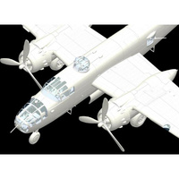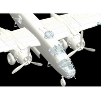 The B-25J was powered by 2 × Wright R-2600-92-14 Twin Cyclone 14-cylinder air-cooled radial engine, 1,700 hp each, and it also carried 9 x .50cal M2 Browning machine guns across waist, tail, dorsal and forward gun positions. A typical medium-range mission would see the B-25J carry around 3,000lbs of bombs. Wingspan was 67ft 7in, with a length of 52ft 11in. A crew of 6 was typical for the B-25J (pilot, co-pilot, navigator, bombardier, turret gunner/engineer, radio operator/waist gunner, tail gunner).