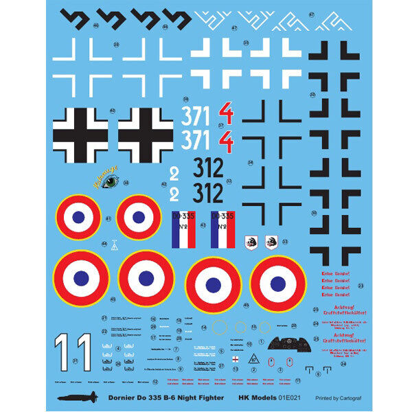 Despite the great hopes that the Germans had for the Do 335, like many of their wonder designs, it simply came too late to make any difference, with only 37 being built by the war’s end. Allies evaluation of this Do 335 ‘Pfeil’ showed that it was an excellent performer and could have been a serious opponent, had it not been for Germany’s lack of production capability and onerous bureaucratic and person- al in-fighting. The subjects of this kit release are the proposed B-6 night fighter variant, and the M17 night fighter prototype that had been completed under the French custody after the end of World War II