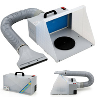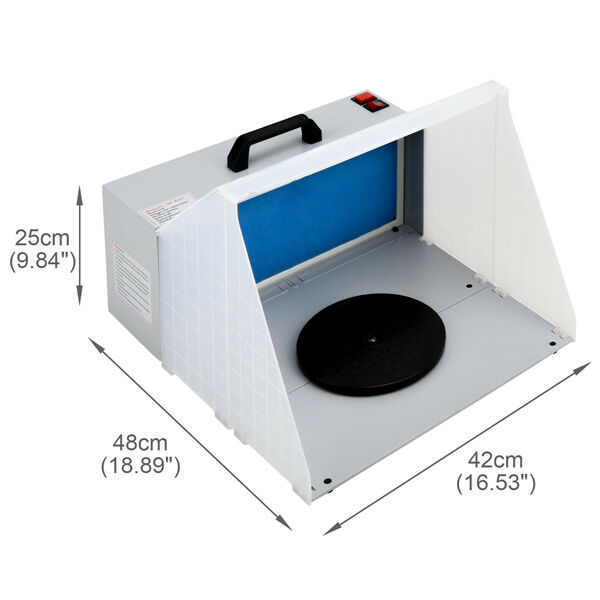 A powerful fan sucks in the paint mist and expels it outside the work area. The kit includes a swivel painting base that allows you to paint objects from all sides without touching the painted object.