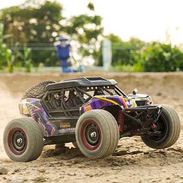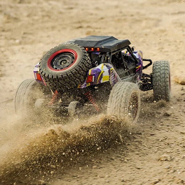This RC car is versatile and suitable for various terrains including flat surfaces, sand, mud, and grass.