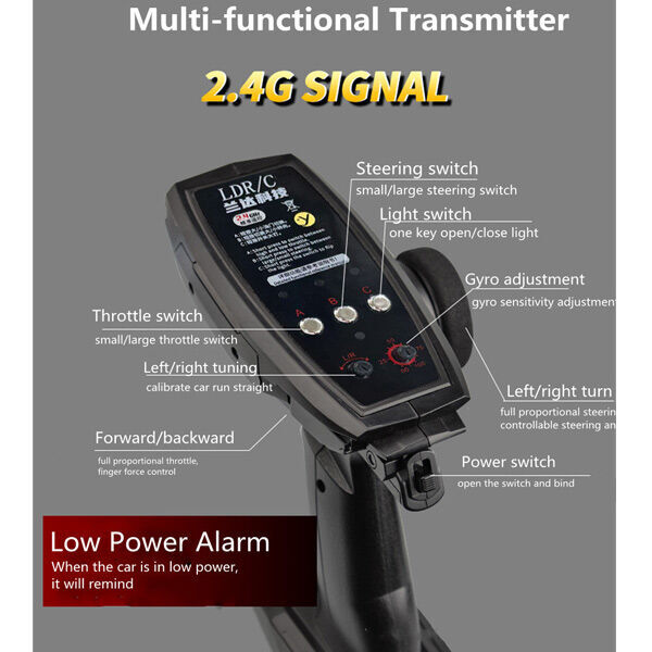 With a powerful 150 brushed high speed motor, 9g steering servo, and independent 4 wheel suspension, this car is more than just a toy—it's a capable performer for both beginners and hobbyists looking for affordable drifting fun. The built in gyroscope system helps maintain stability during aggressive slides, while the 2.4GHz 3 channel transmitter offers responsive, interference free control.