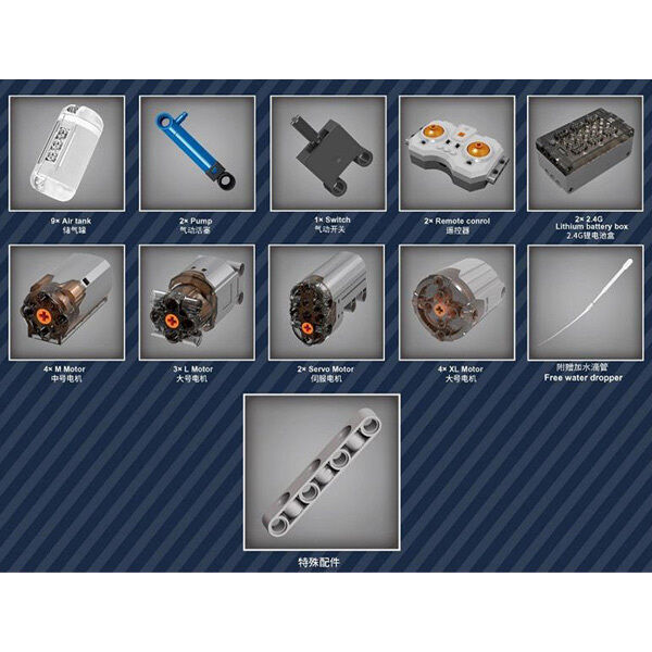 • This building set comes with relevant power accessories, including water storage tank, pneumatic piston, pneumatic switch, remote control, 2.4GH lithium battery box, medium motor, large motor, servo motor, extra large motor and special accessories.