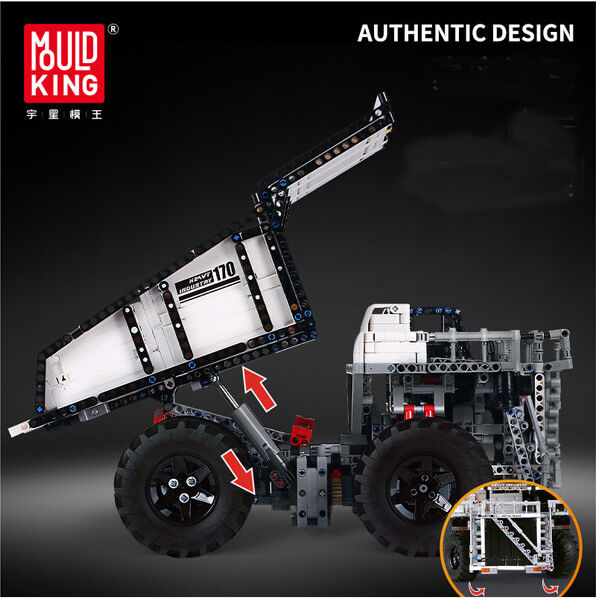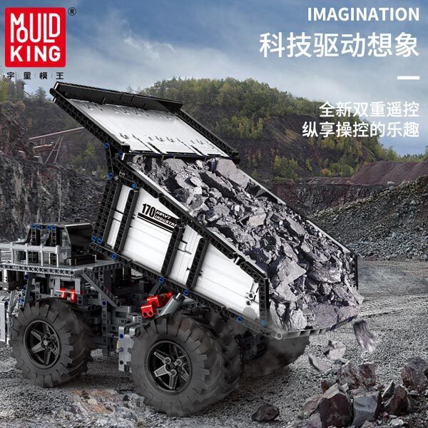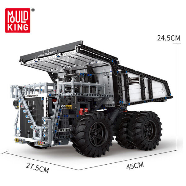 The mining truck is a heavy-duty dump truck used in open-pit mines to complete the tasks of rock and soil stripping and ore transportation. Liebherr T284 is a well-received model in the mining industry. Among the super-large dump trucks, it maintains the title of lightest (lightweight when empty) and maximum rated load, with a power of up to 4000 horsepower. This latest model can further help customers increase production capacity and reduce the number of trucks or working hours. Build this MOULD KING 13170 Mining Truck, and control the operation and various mechanical actions of the mining truck through APP or remote control.
