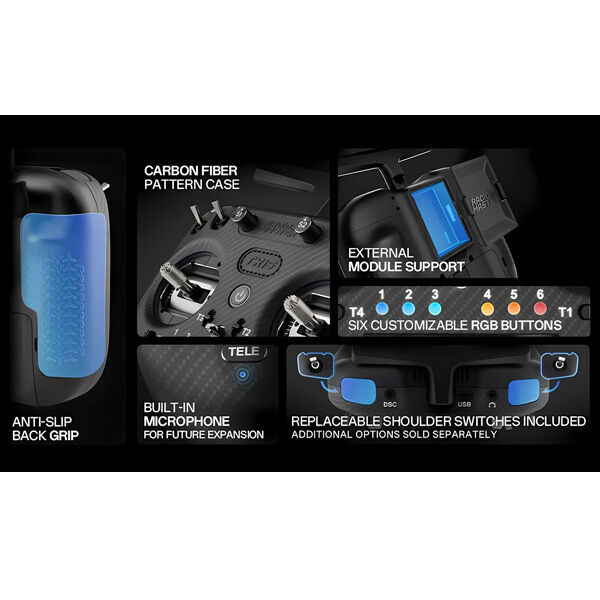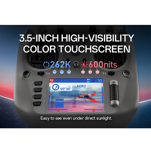 At its core, the TX15 Max is powered by the blazing fast STM32 H7 chip, delivering a responsive and fluid control experience. The AG02 CNC Hall sensor gimbals offer exceptional precision and smoothness, with an updated design that offers reduced weight and adjustable travel for a truly custom feel. Integrated RGB LED rings around the gimbals add a striking visual touch with LUA controlled lighting effects. The vibrant 3.5 inch IPS touchscreen provides sharp visuals and intuitive navigation, while other highlights include a powerful cooling fan, USB-C connectivity, and flexible battery support to keep you flying longer.