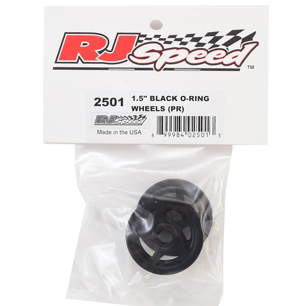 This is a pair of 1.5 Diameter Black O-Ring Wheels for the RJ Speed 13 Wheelbase Funny Car - RJSC2002 and the 24 Wheelbase Dragster - RJSC2003
