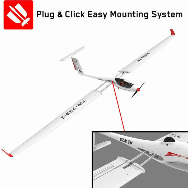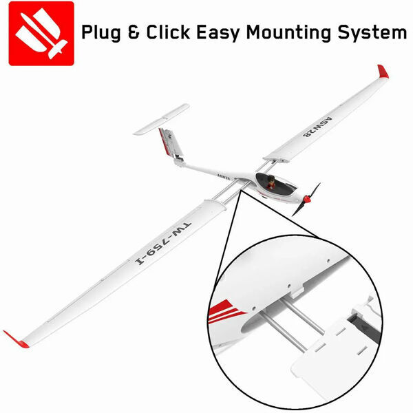 The battery is accessible after removing the canopy/cabin, which is secured with a snap lock. The wings now have two attachment bags to provide extra rigidity during looping and high bank speeds. The wings are also easier to assemble with a plastic lock that holds them in place. The battery and radio compartment has been expanded compared to the V1, allowing you to add FPV gear if you like. The V2 has also been upgraded with better rubber wheels that make it easier to land on hard runways and short grass.