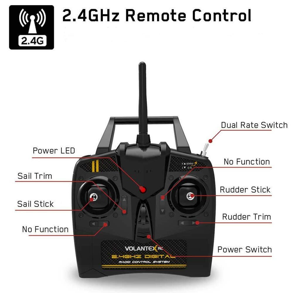 With a modern 2.4 GHz transmitter, you get a noise free experience with long range and fast response. Thanks to this technology, you can sail side by side with other RC enthusiasts without the signals interfering with each other. With the controller, you not only control the course, but also adjust the sails in and out. To get started, a total of 8 AA batteries are required (4 for the boat and 4 for the transmitter, not included).