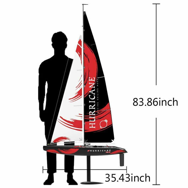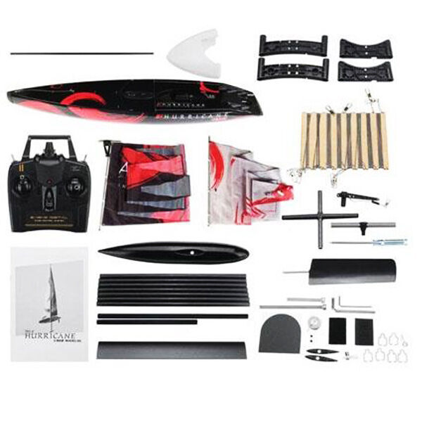 The Volantex  Hurricane is a large 1m length sailboat and measuring in at 213cm tall (tip to ballast) it is a impressive model. Coming mostly factory assembled, the blow moulded ABS hull features a sealed radio box that houses a 2.4ghz radio system, winch and rudder servo and Li-ion receiver battery.